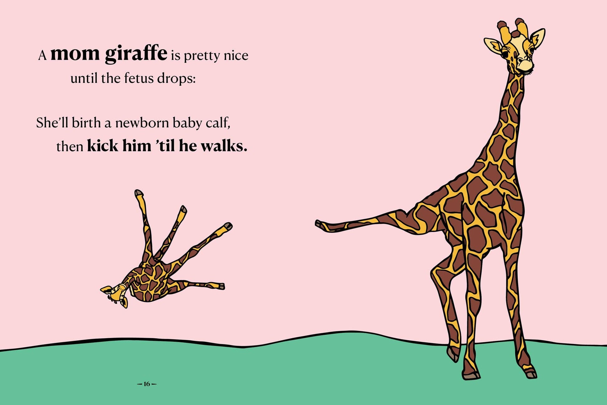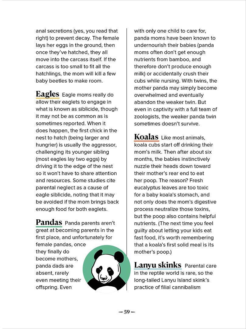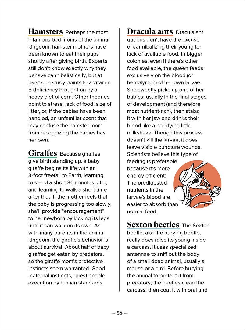 A hilarious and reassuring gift for every mom: because we’re all doing the best we can, and the natural world is filled with moms worse than you! A mom giraffe is pretty nice until the fetus drops. She’ll birth a newborn baby calf, then kick him ’til he walks. Whenever you feel guilty that you haven’t cleaned the house: Sexton beetles raise their kids in a decomposing mouse. A koala mom will feed her kids her own poop. Yes, poop. Panda moms will abandon one twin because raising two is, well, just too much. And every now and then a cuddly little hamster mom will —yup— eat her newborn pups. These and other true facts from the animal kingdom offer a hilarious reality check on what constitutes “good parenting."